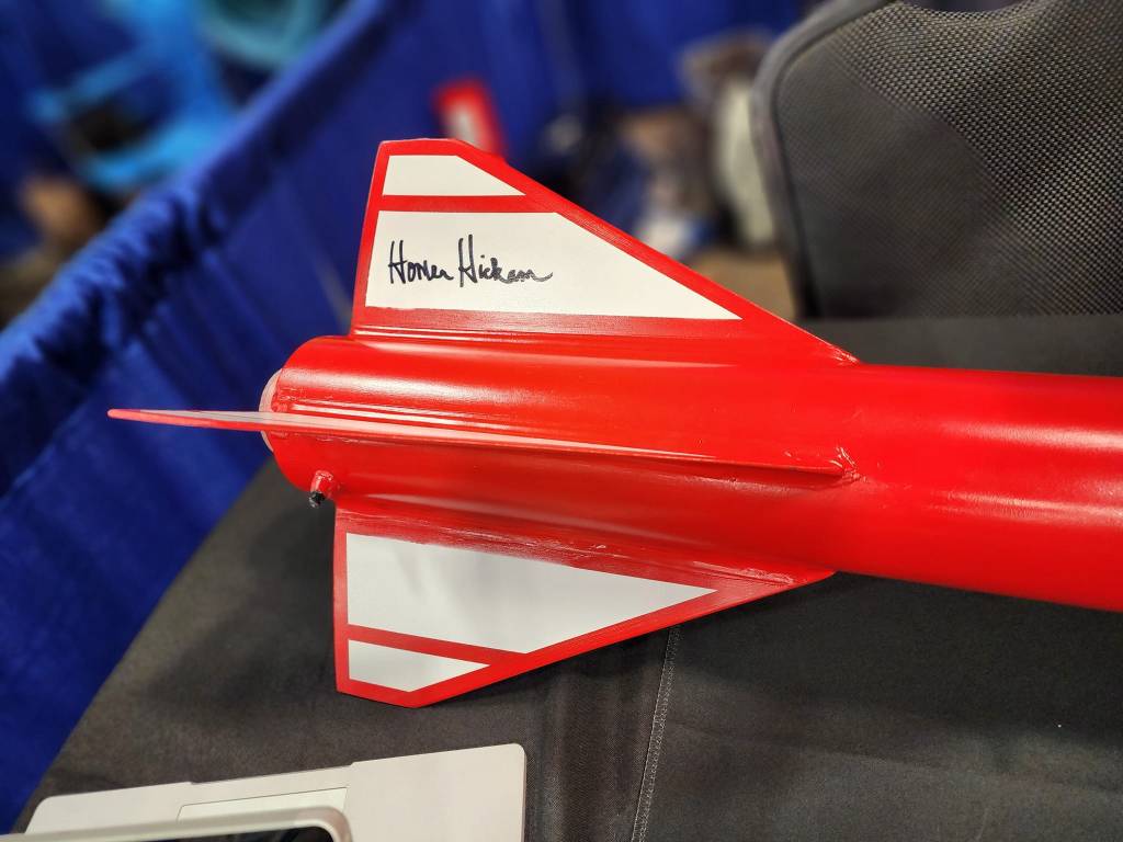 From April 12th to 15th, NASA hosted the SLI Launch week in Huntsville, Alabama, which our entire team attended. The event started on Wednesday with hardware checks and ended on Saturday with the final launch. On Thursday, a Launch Readiness Review presentation took place, followed by a team social event that provided an opportunity for teams to interact and network. On Friday, our team participated in team pictures and the rocket fair, where we had the pleasure of meeting Homer Hickam, an author and former NASA engineer, who autographed one of our rocket fins! The launch on Saturday was a success, and the entire week was a remarkable experience for our team!